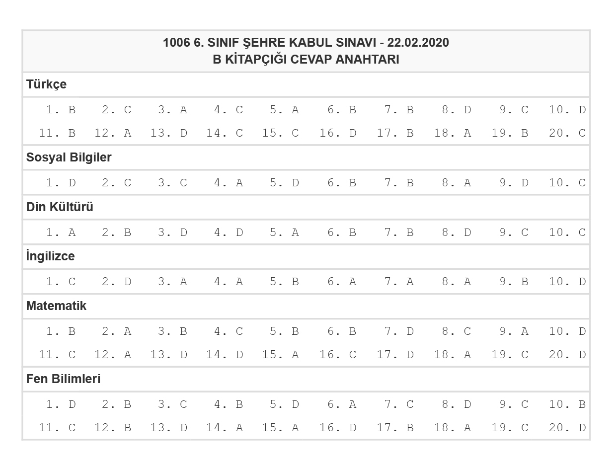 6. SINIFLAR ŞEHRE KABUL SINAVI CEVAP ANAHTARI